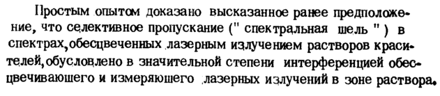 Простым опытом доказано высказанное ранее предположение, что селективное пропускание (" спектральная шель " ) в спектрах,обесцвеченных лазерным излучением растворов красителей, обуслоэлено в значительной степени интерференцией обесцвечивающего и измеряющего лазерных излучений в зоне раствора.
