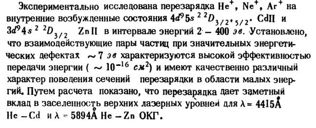 Экспериментально исследована перезарядка Не+, Ne+, Аг+ на внутренние возбужденные состояния 4</95« 2 2^ь/2> 5/2· Cdll и 3£^4« 2 20}/2 Zn II в интервале энергий 2 400 эв. Установлено, что взаимодействующие пары частиц при значительных энергетических дефектах ~ 7 эв характеризуются высокой эффективностью передачи энергии ( ~ 10~16 см2) и имеют качественно различный характер поведения сечений перезарядки в области малых энергий. Путем расчета показано, что перезарядка дает заметный вклад в заселенность верхних лазерных уровней для λ= 441δΑ Не -Cd и λ 5894А Не Zn ОКГ.