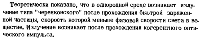 Теоретически показано, что в однородной среде возникает излучение типа "черенковского" после прохождения быстрой заряженной частицы, скорость которой меньше фазовой скорости света в веществе. Излучение возникает после прохождения когерентного оптического импульса.