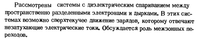 Рассмотрены системы с диэлектрическим спариванием между пространственно разделенными электронами и дырками. В этих системах возможно сверхтекучее движение зарядов, которому отвечают незатухающие электрические токи. Обсуждается роль межзонных переходов.