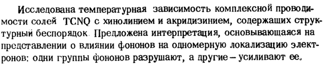Исследована температурная зависимость комплексной проводимости солей TCNQ с хинолинием и акридизинием, содержащих структурный беспорядок Предложена интерпретация, основывающаяся на представлении о влиянии фононов на одномерную локализацию электронов: одни группы фононов разрушают, а другие-усиливают ее.