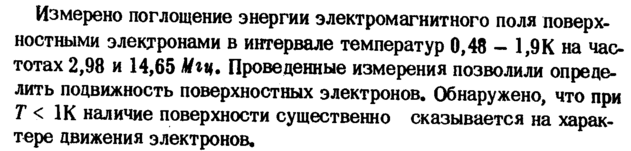 Измерено поглощение энергии электромагнитного поля поверхностными электронами в интервале температур 0,48 1,9 К на частотах 2,98 и 14,65 Мгц. Проведенные измерения позволили определить подвижность поверхностных электронов. Обнаружено, что при Τ < 1К наличие поверхности существенно сказывается на характере движения электронов.