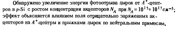 Обнаружено увеличение энергии фотоотрыва дырок от А "''-центров в p-Si с ростом концентрации акцепторов ΝΛ при ΝΑ = 10l5* 1017см~3; эффект объясняется влиянием поля отрицательно заряженных акцепторов на Л +-центры и прыжками дырок по нейтральным примесям.