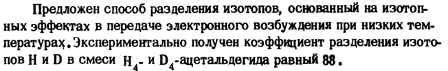 Предложен способ разделения изотопов, основанный на изотопных эффектах в передаче электронного возбуждения при низких тем-пература^. Экспериментально получен коэффициент разделения изотопов Η и D в смеси Н4и 04-ацетальдегида равный 88.