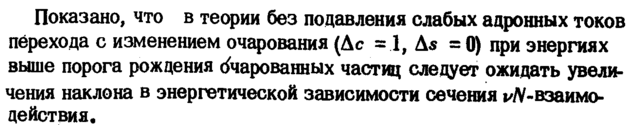 Показано, что в теории без подавления слабых адронных токов перехода с изменением очарования (Ас =1, As =0) при энергиях выше порога рождения Очарованных частиц следует ожидать увеличения наклона в энергетической зависимости сечения ^-взаимодействия.