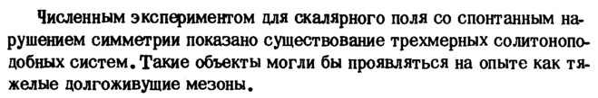 Численным экспериментом для скалярного поля со спонтанным нарушением симметрии показано существование трехмерных солитонопо-добных систем. Такие объекты могли бы проявляться на опыте как тяжелые долгоживущие мезоны.
