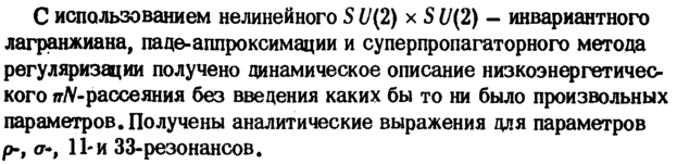 С использованием нелинейного S U(2) χ S U(2) инвариантного лагранжиана, паце-аппроксимации и суперпропагаторного метода регуляризации получено динамическое описание низкоэнергетического ^-рассеяния без введения каких бы то ни было произвольных параметров. Получены аналитические выражения для параметров ρ-, σ·, 11-и 33-резонансов.