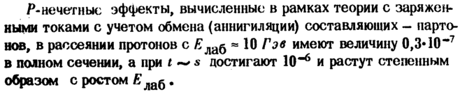Р-нечетные эффекты, вычисленные в рамках теории с заряженными токами с учетом обмена (аннигиляции) составляющих парто-нов, в рассеянии протонов с £лаб = 10 Гэв имеют величину 0,3· 10""7 в полном сечении, а при t — * достигают ДО"6 и растут степенным образом с ростом £лаб ·