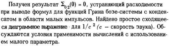Получен результат ΣΟ2(0) = 0, устраняющий расходимости при выводе формул для функций Грина бозе-системы с конденсатом в области малых импульсов. Найдено простое сходящееся диаграммное выражение ■ для 1/с 2 (с — скорость звука). Обсуждаются условия применимости вычислений с использованием малого параметра.