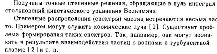 Получены точные степенные решения, обращающие в нуль интеграл столкновений кинетического уравнения Больцмана. Степенные распределения (спектры) частиц встречаются весьма час то. Примером могут служить космические лучи [1]. Существует проблема формирования таких спектров. Так, например, они могут возникать в результате взаимодействия частиц с волнами в турбулентной плазме [2] и т. п.