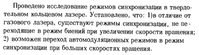 Проведено исследование режимов синхронизации в твердотельном кольцевом лазере. Установлено, что: 1)в отличие от газового лазера, существуют режимы синхронизации, не переходящие в режим биений при увеличении скорости вращения; 2) возможен переход автомодуляционных режимов в режим синхронизации при больших скоростях вращения.