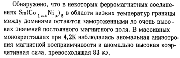 Обнаружено, что в некоторых ферромагнитных соединениях Sm(Co lwXNix)5 в области низких температур границы между доменами остаются замороженными до очень высоких значений постоянного магнитного поля. В массивных монокристаллах при 4,2К наблюдалась аномальная анизотропия магнитной восприимчивости и аномально высокая коэрцитивная сила, превосходящая 83 кэ.