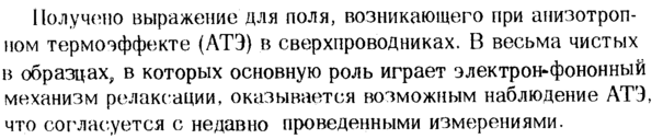 Получено выражение для поля, возникающего при анизотропном термоэффекте (АТЭ) в сверхпроводниках. В весьма чистых в образцах, в которых основную роль играет электрон-фононный механизм релаксации, оказывается возможным наблюдение АТЭ, что согласуется с недавно проведенными измерениями.