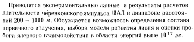 Приводятся экспериментальные данные и результаты расчетов длительности чёренковскогоимпульса ШАЛ в диапазоне расстояний 200 1000 м. Обсуждается возможность определения состава первичного излучения, выбора модели развития ливня и оценки пробега ядерного взаимодействия в области энергий выше 1017 эв.