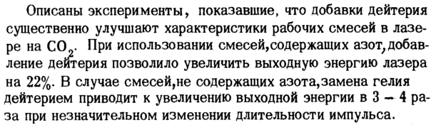 Описаны эксперименты, показавшие, что добавки дейтерия существенно улучшают характеристики рабочих смесей в лазере на С02При использовании смесей,содержащих азот, добавление дейтерия позволило увеличить выходную энергию лазера на 22%. В случае смесей,не содержащих азота,замена гелия дейтерием приводит к увеличению выходной энергии в 3 4 раза при незначительном изменении длительности импульса.