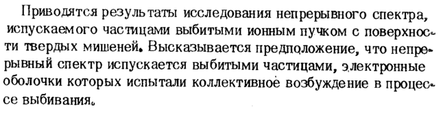 Приводятся результаты исследования непрерывного спектра, испускаемого частицами выбитыми ионным пучком с поверхности твердых мишеней. Высказывается предположение, что непрерывный спектр испускается выбитыми частицами, электронные оболочки которых испытали коллективное возбуждение в процессе выбивания*