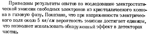 Приведены результаты опытов по исследованию электростати* ческой эмиссии свободных электронов из кристаллического ксенона в газовую фазу* Показано, что при напряженности электричео кого паля около 5 кв/см вероятность эмиссии достигает единщы, что позволяет использовать обнаруженный эффект в детекторах частиц»