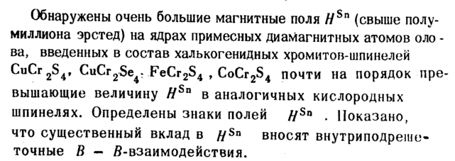 Обнаружены очень большие магнитные поля Η (свыше полумиллиона эрстед) на ядрах примесных диамагнитных атомов оло -ва, введенных в состав халькогенидных хромитов-шпинелей CuCr2S4, CuCr2Se4-FeCr2S4 , CoCr2S4 почти на порядок превышающие величину //Sn в аналогичных кислородных шпинелях. Определены знаки полей ffSa . Показано, что существенный вклад в fjSa вносят внутриподреше-точные В S-взаимодействия.