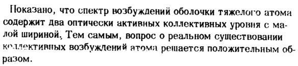Показано, что спектр возбуждений оболочки тяжелого атома содержит два оптически активных коллективных уровня с малой шириной.. Тем самым, вопрос о реальном существовании коллективных возбуждений атома решается положительным образом.