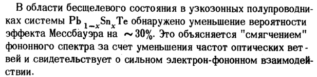 В области бесщелевого состояния в узкозонных полупроводниках системы РЬ x_xSnxTe обнаружено уменьшение вероятности эффекта Мессбауэра на ~30%. Это объясняется "смягчением" фононного спектра за счет уменьшения частот оптических вет -вей и свидетельствует о сильном электрон-фононном взаимодействии.