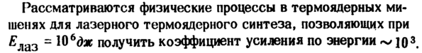 Рассматриваются физические процессы в термоядерных мишенях для лазерного термоядерного синтеза, позволяющих при ^лаз = 1°6дж получить коэффициент усиления по энергии ~ ю3.