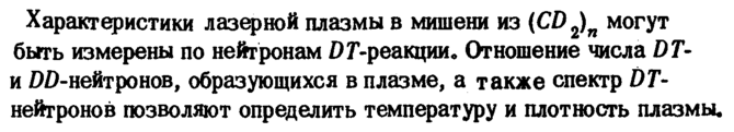 Характеристики лазерной плазмы в мишени из (CD2)n могут быть измерены по нейтронам ОГ-реакции« Отношение числа DT-и DD-нейтронов, образующихся в плазме, а также спектр DT-нейтронов позволяют определить температуру и плотность плазмы*