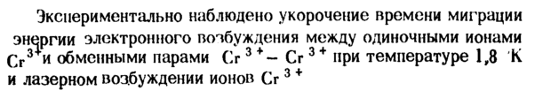Экспериментально наблюдено укорочение времени миграции энергии электронного возбуждения между одиночными ионами Сг и обменными парами Сг3 Сг3+ при температуре 1,8 К и лазерном возбуждении ионов Сг3 +