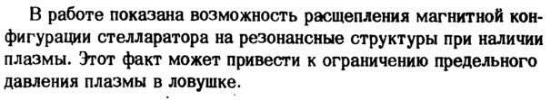 В работе показана возможность расщепления магнитной конфигурации стелларатора на резонансные структуры при наличии плазмы. Этот факт может привести к ограничению предельного давления плазмы в ловушке.