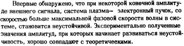 Впервые обнаружено, что при некоторой конечной амплитуде внешнего сигнала, система плазмаэлектронный пучок, со скоростью больше максимальной фазовой скорости волны в системе, становится неустойчивой. Экспериментально полученные значения амплитуд, при которых начинает развиваться неустойчивость, хорошо совпадают с теоретическими.