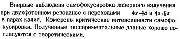 Впервые наблюдена самофокусировка лазерного излучения при двухфотонном резонансе с переходами 4s-4d и 4^-6$ в парах калия. Измерены критические интенсивности самофокусировки. Полученные экспериментальные данные хорошо согласуются с теоретическими.