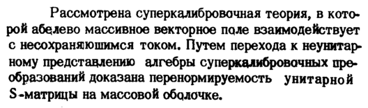Рассмотрена суперкалибровочная теория, в которой абелево массивное векторное поле взаимодействует с несохраняюшимся током. Путем перехода к неунитарному представлению алгебры суперкалибровочных преобразований доказана перенормируемость унитарной S -матрицы на массовой обдлочке.