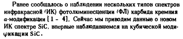 Ранее сообщалось о наблюдении нескольких типов спектров инфракрасной 'ИК) фотолюминесценции 'ФЛ) карбида кремния α-модификации ΐ 1 4]t Сейчас мы приводим данные о новом ИК спектре SiC, впервые наблюдавшемся на кубической модификации SiC.