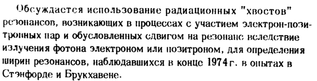 Обсуждается использование радиационных "хвостов" резонансоп, возникающих в процессах с участием электрон-пози-тропных пар и обусловленных сдвигом на резонанс вследствие излучения фотона электроном или позитроном, для определения ширин резонансов, наблюдавшихся в конце 1974 г. в опытах в Стэнфорде и Брукхавене.