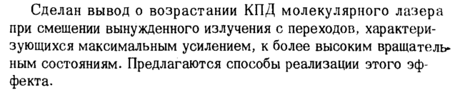Сделан вывод о возрастании КПД молекулярного лазера при смещении вынужденного излучения с переходов, характеризующихся максимальным усилением, к более высоким вращатель* ным состояниям. Предлагаются способы реализации этого эффекта.