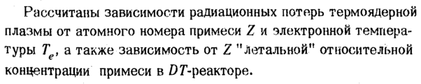 Рассчитаны зависимости радиационных потерь термоядерной плазмы от атомного номера примеси Ζ и электронной температуры Τ , а также зависимость от Ζ "летальной1* относительной концентрации примеси в ОГ-реакторе.