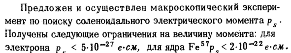 Предложен и осуществлен макроскопический эксперимент по поиску соленоидального электрического момента ps . Получены следующие ограничения на величину момента: для электрона ре, < 5*10~27 е-см, для ядра Fe57pc< 2Л0~*22е-см.