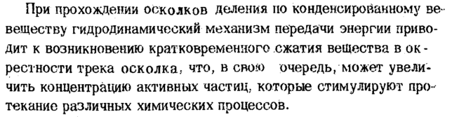 При прохождении осколков деления по конденсированному ве · веществу гидродинамический механизм передачи энергии приводит к возникновению кратковременного сжатия вещества в окрестности трека осколка, что, в свою очередь, может увеличить концентрацию активных частиц, которые стимулируют про текание различных химических процессов.