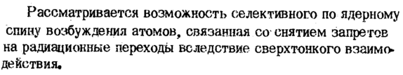Рассматривается возможность селективного по ядерному спину возбуждения атомов, связанная со снятием запретов на радиационные переходы вследствие сверхтонкого взаимо* действия.