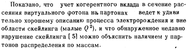 Показано, что учет когерентного вклада в сечение рассеяния виртуального фотона н&партонах ведет к удиви тельно хорошему описанию процесса электророждекия и вне области скейлинга (малые Q2), и что обнаруженное недавно нарушение скейлинга [ 5] можно объяснить наличием у пар-тонов распределения по массам.