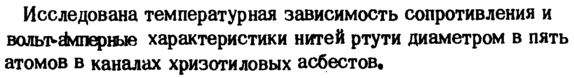 Исследована температурная зависимость сопротивления и вольт*^мперше характеристики нитей ртути диаметром в пять атомов в каналах хризотиловых асбестов.