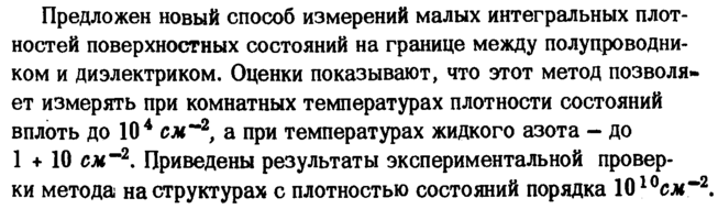 Предложен новый способ измерений малых интегральных плотностей поверхностных состояний на границе между полупроводником и диэлектриком. Оценки показывают, что этот метод позволяет измерять при комнатных температурах плотности состояний вплоть до 10 4 еж"*2, а при температурах жидкого азота до 1 + 10 см"2. Приведены результаты экспериментальной проверки метода на структурах с плотностью состояний порядка 1010cw~2.