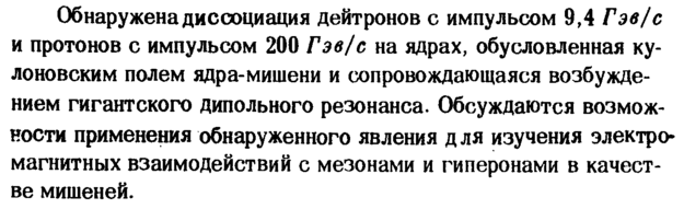 Обнаружена диссоциация дейтронов с импульсом 9,4 Гэв/с и протонов с импульсом 200 Гэв/с на ядрах, обусловленная ку-лоновским полем ядра-мишени и сопровождающаяся возбуждением гигантского дипольного резонанса. Обсуждаются возможности применения обнаруженного явления для изучения электромагнитных взаимодействий с мезонами и гиперонами в качестве мишеней.