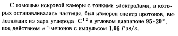 С помощью искровой камеры с тонкими электродами, в которых останавливались частицы, был измерен спектр протонов, вылетающих из ядра углерода С12 в угловом диапазоне 95±20°, под действием 7г~-мезонов с импульсом 1,06 Гэв/с.