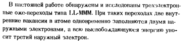 В настоящей работе обнаружены и исследованы трохэлоктрон-ные оже-переходы типа LL-MMM. При таких переходах две внутренние вакансии в атоме одновременно заполняются двумя наружными электронами, а всю высвобождающуюся энергию уносит третий наружный электрон.