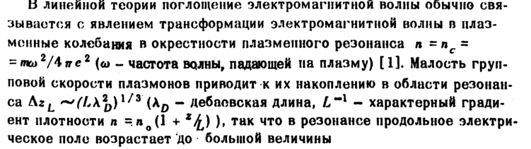 В линейной теории поглощение электромагнитной волны обычно связывается с явлением трансформации электромагнитной волны в плазменные колебания в окрестности плазменного резонанса η = пс = = №>2/4ire2 (ω частота волны, падающей на плазму) [1]. Малость групповой скорости плазмонов приводит к их накоплению в области резонанса AzL ^(L\2D)1^3 (\D дебаевская длина, L"x характерный градиент плотности η =. по(1 + г£) ), так что в резонансе продольное электрическое поле возрастает до большой величины