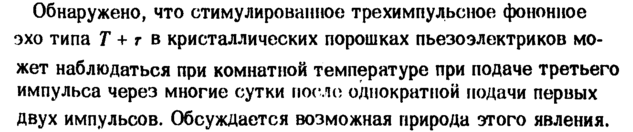 Обнаружено, что стимулированное трехимпульсное фононное эхо типа Τ + τ в кристаллических порошках пьезоэлектриков может наблюдаться при комнатной температуре при подаче третьего импульса через многие сутки после; однократной подачи первых двух импульсов. Обсуждается возможная природа этого явления.