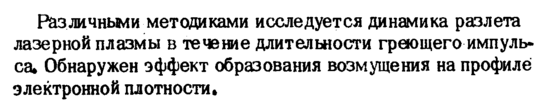 Различными методиками исследуется динамика разлета лазерной плазмы в течение длительности греющего импульса» Обнаружен эффект образования возмущения на профиле электронной плотности.