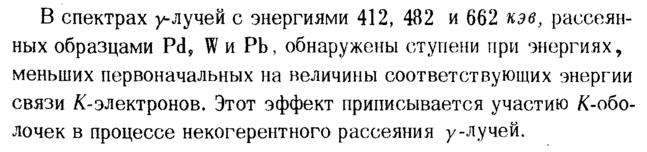 В спектрах у-лучей с энергиями 412, 482 и 662 кэб, рассеянных образцами Pd9 W и РЬ, обнаружены ступени при энергиях, меньших первоначальных на величины соответствующих энергии связи /(-электронов. Этот эффект приписывается участию /(-оболочек в процессе некогерентного рассеяния у-лучей.