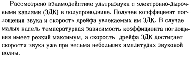 Рассмотрено взаимодействие ультразвука с электронно-дырочными каплями (ЭДК) в полупроводнике. Получен коэффициент поглощения звука и скорость дрейфа увлекаемых им ЭДК. В случае малых капель температурная зависимость коэффициента поглощения имеет резкий максимум, а скорость дрейфа ЭДК достигает скорости звука уже при весьма небольших амплитудах звуковой волны.