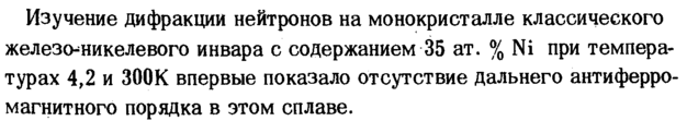 Изучение дифракции нейтронов на монокристалле классического железо-никелевого инвара с содержанием 35 ат. % Ni при температурах 4,2 и 300К впервые показало отсутствие дальнего антиферромагнитного порядка в этом сплаве.